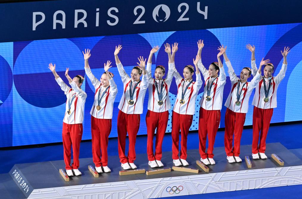 8月7日,花样游泳集体项目冠军中国队在颁奖仪式上向观众致意。新华社记者 夏一方 摄