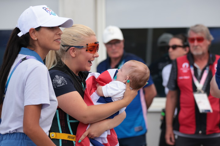 8月4日,英国选手安伯·拉特在赛后与儿子一起庆祝。(图片来自国际射联)