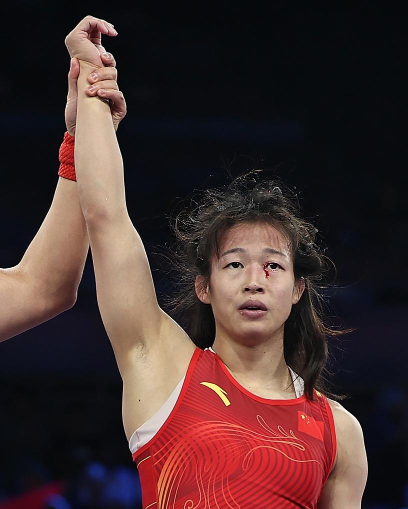 8月7日,裁判宣布中国选手冯紫琪获胜。新华社记者 张帆 摄