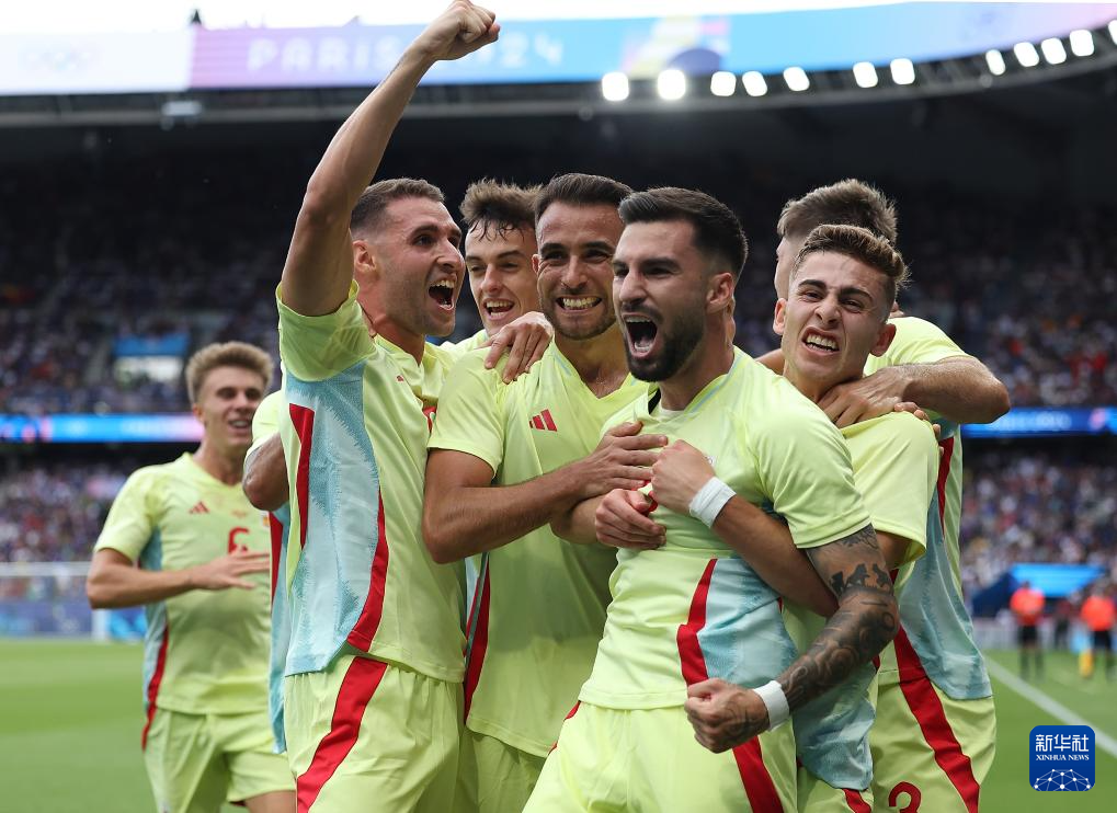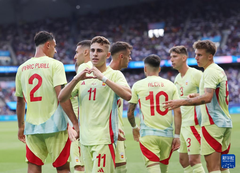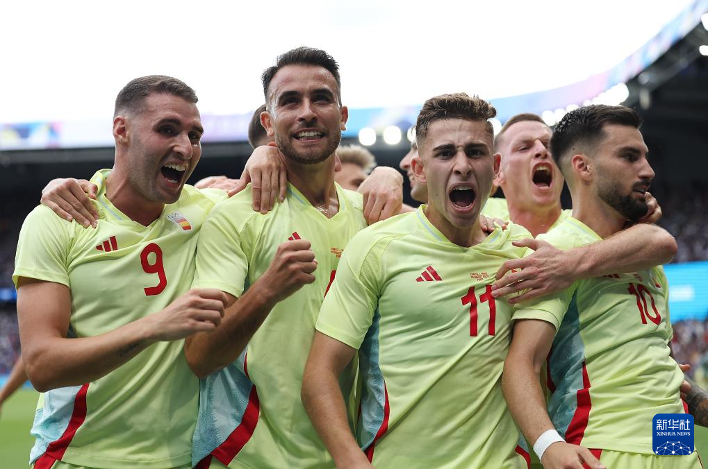 8月9日,西班牙队球员庆祝进球。新华社记者 曹灿 摄