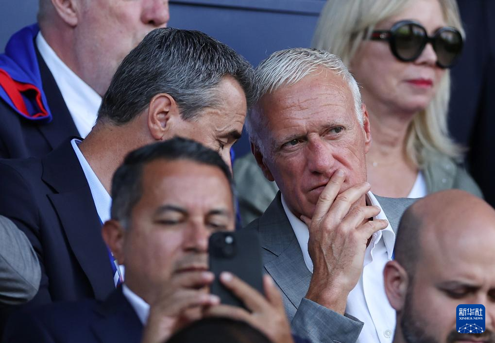 8月9日,法国国家队主教练德尚(右)在比赛前。新华社记者 贾浩成 摄