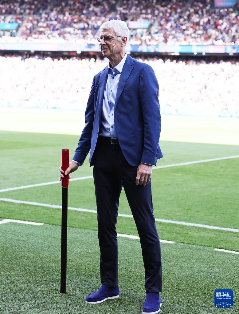 8月9日,法国足球名帅温格为球赛开场。新华社记者 贾浩成 摄