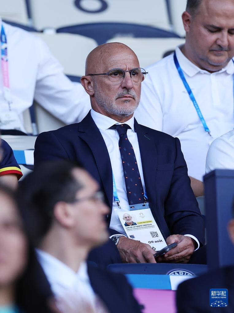 8月9日,西班牙国家队主教练德拉富恩特在比赛前。新华社记者 贾浩成 摄
