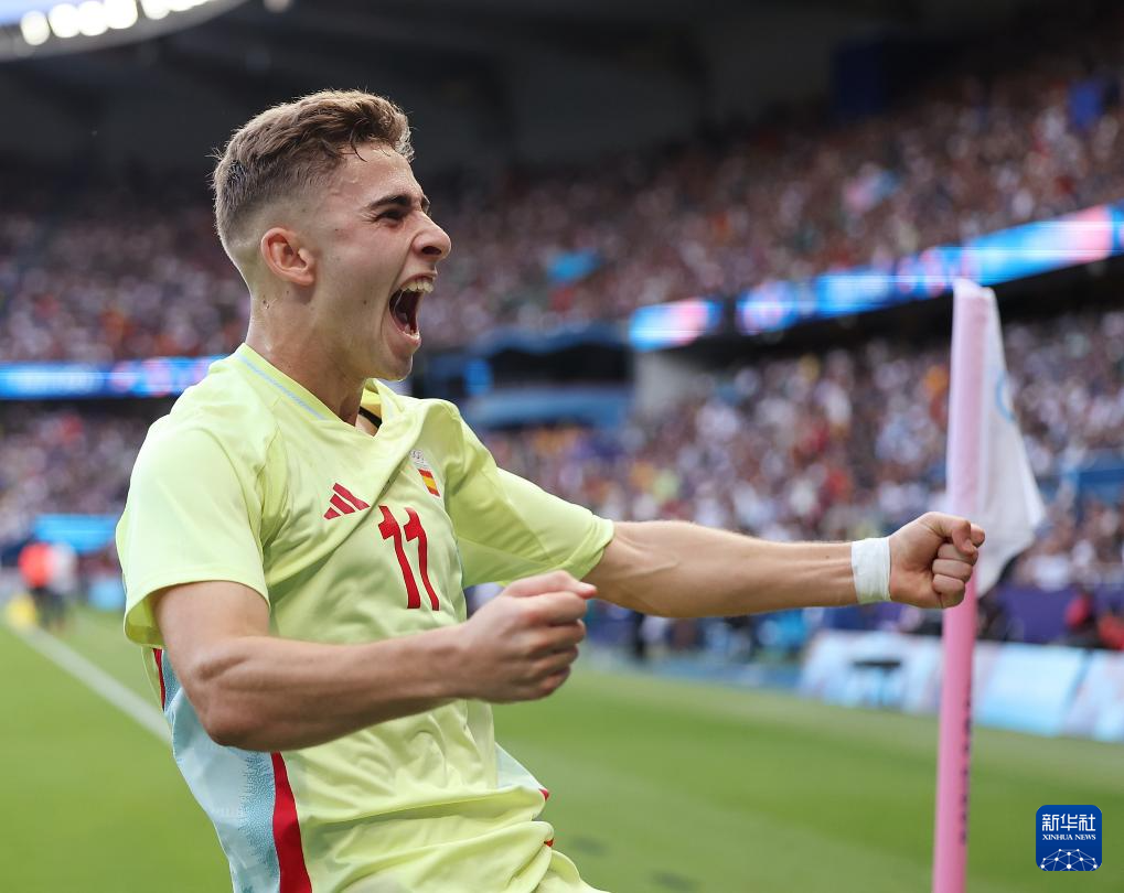 8月9日,西班牙队球员洛佩斯庆祝进球。新华社记者 曹灿 摄
