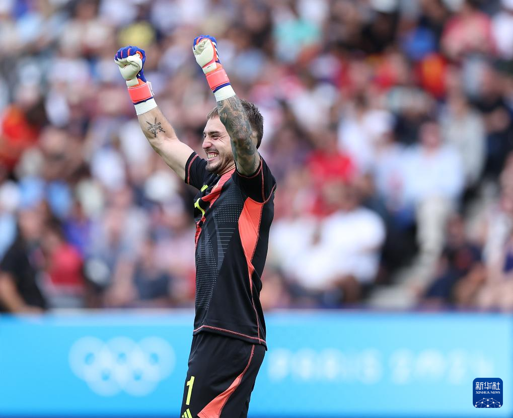 8月9日,西班牙队守门员特纳斯庆祝球队得分。新华社记者 贾浩成 摄