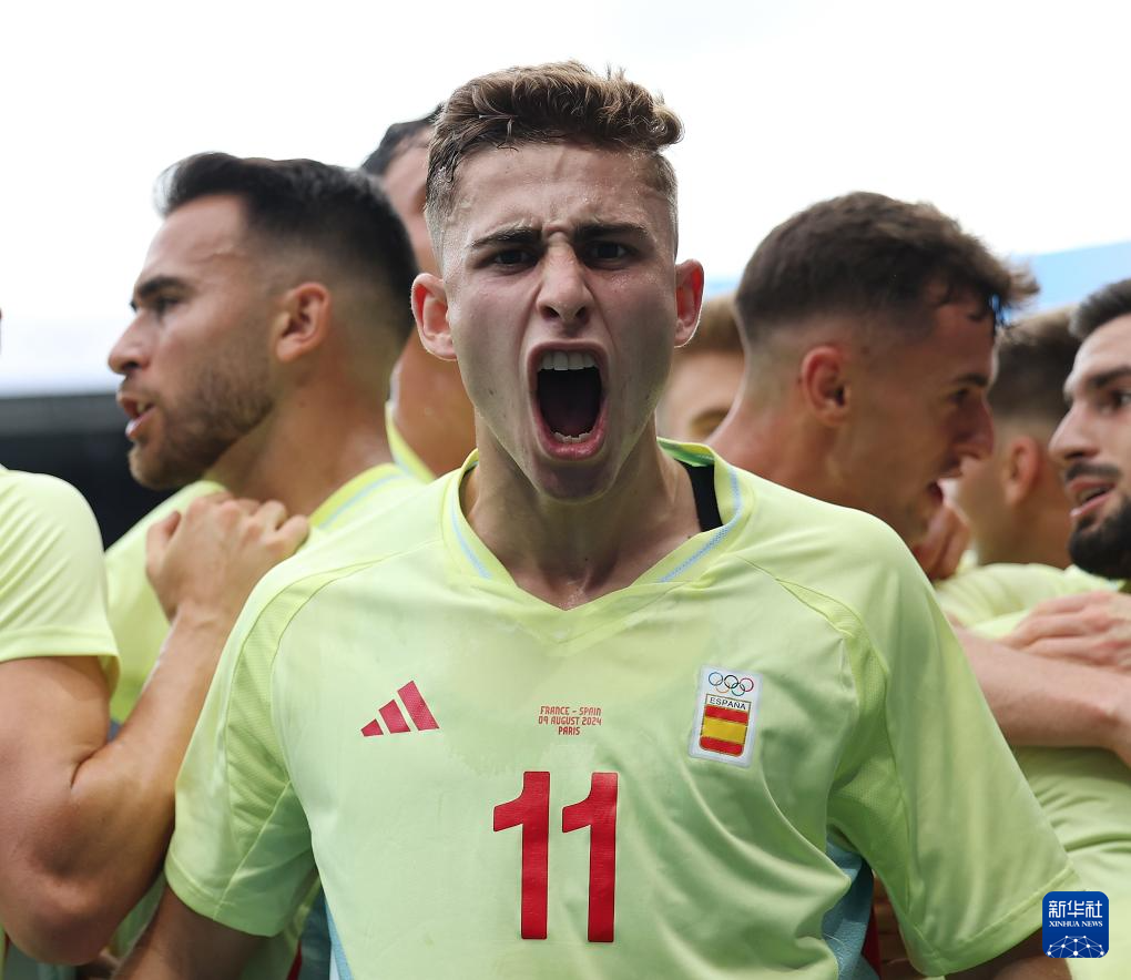 8月9日,西班牙队球员巴埃纳庆祝进球。新华社记者 曹灿 摄