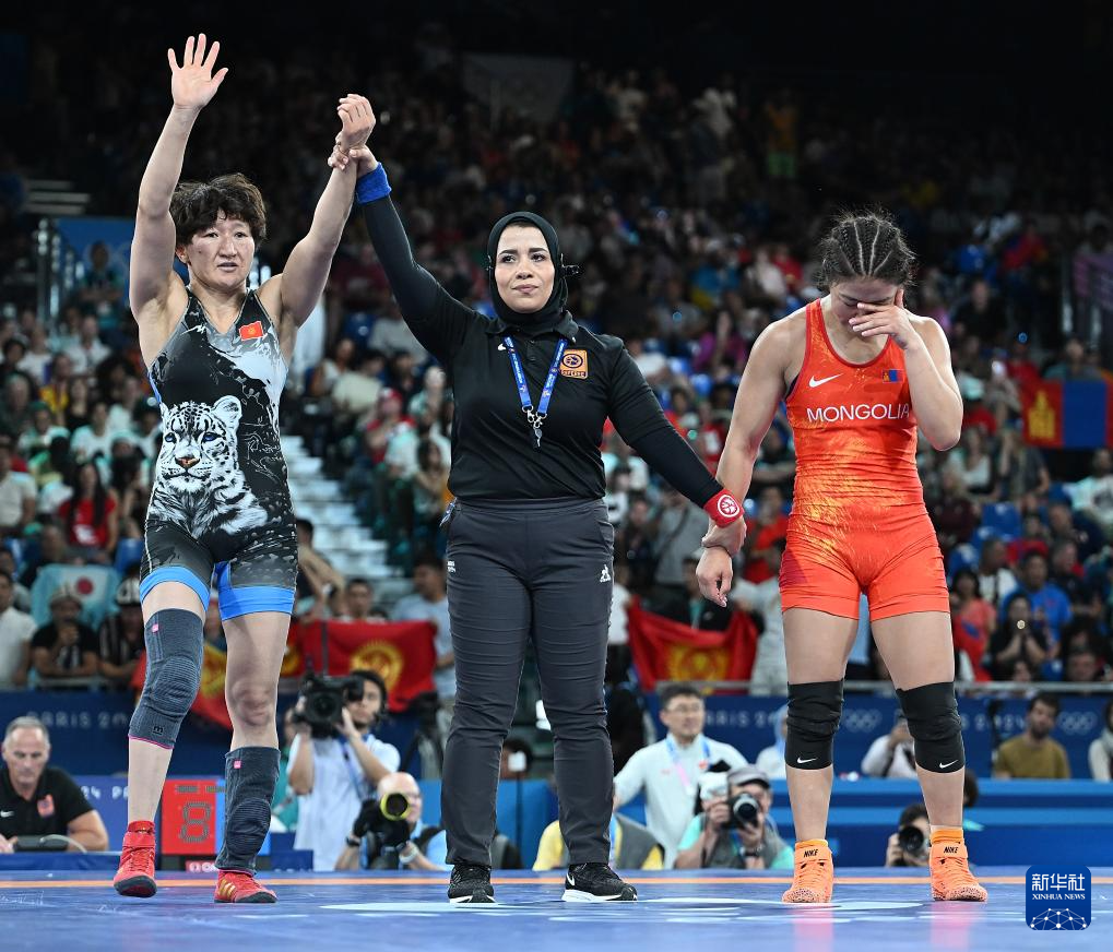 8月10日,裁判宣布塔吉克斯坦选手特尼别科娃(左)战胜蒙古选手普列布道尔吉(右)。