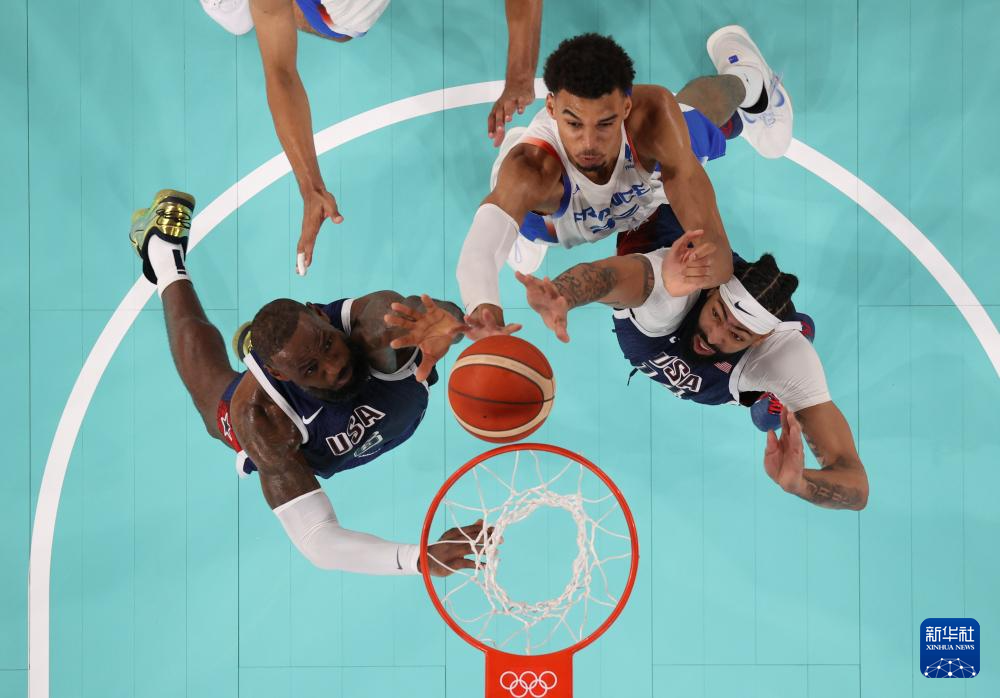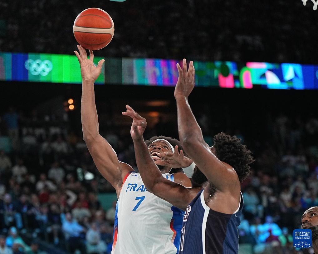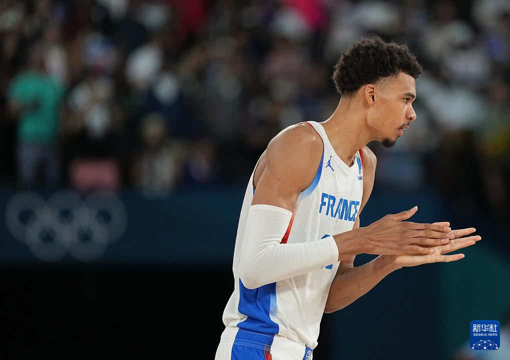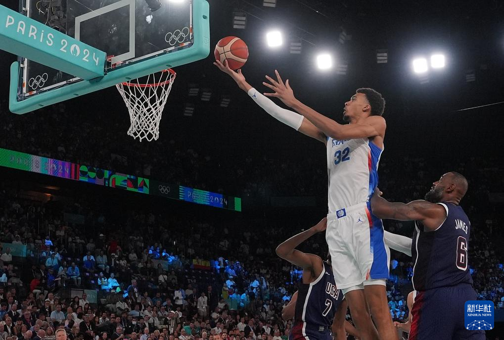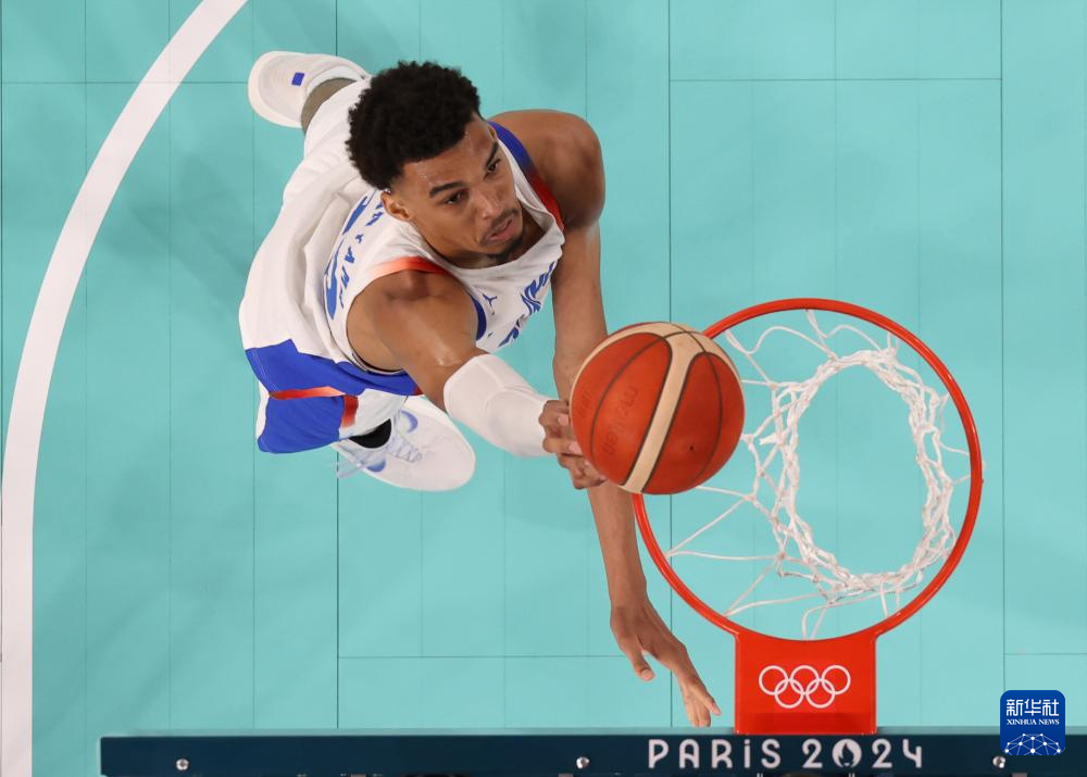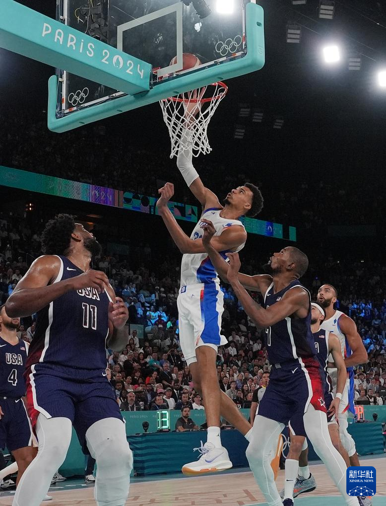 8月10日,法国队球员文班亚马在比赛中上篮。