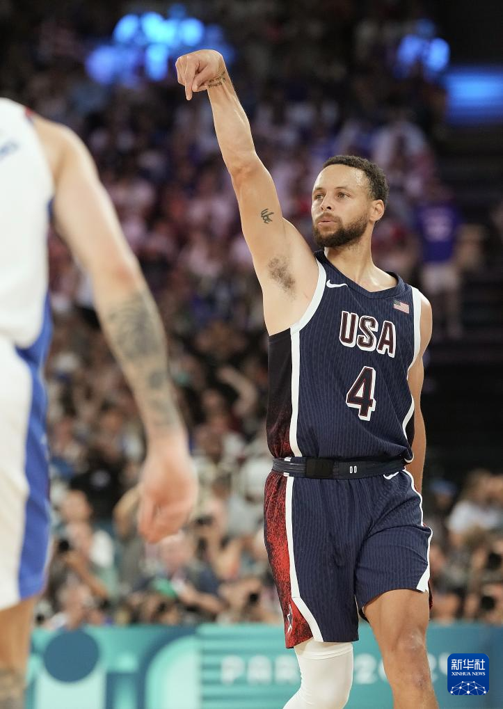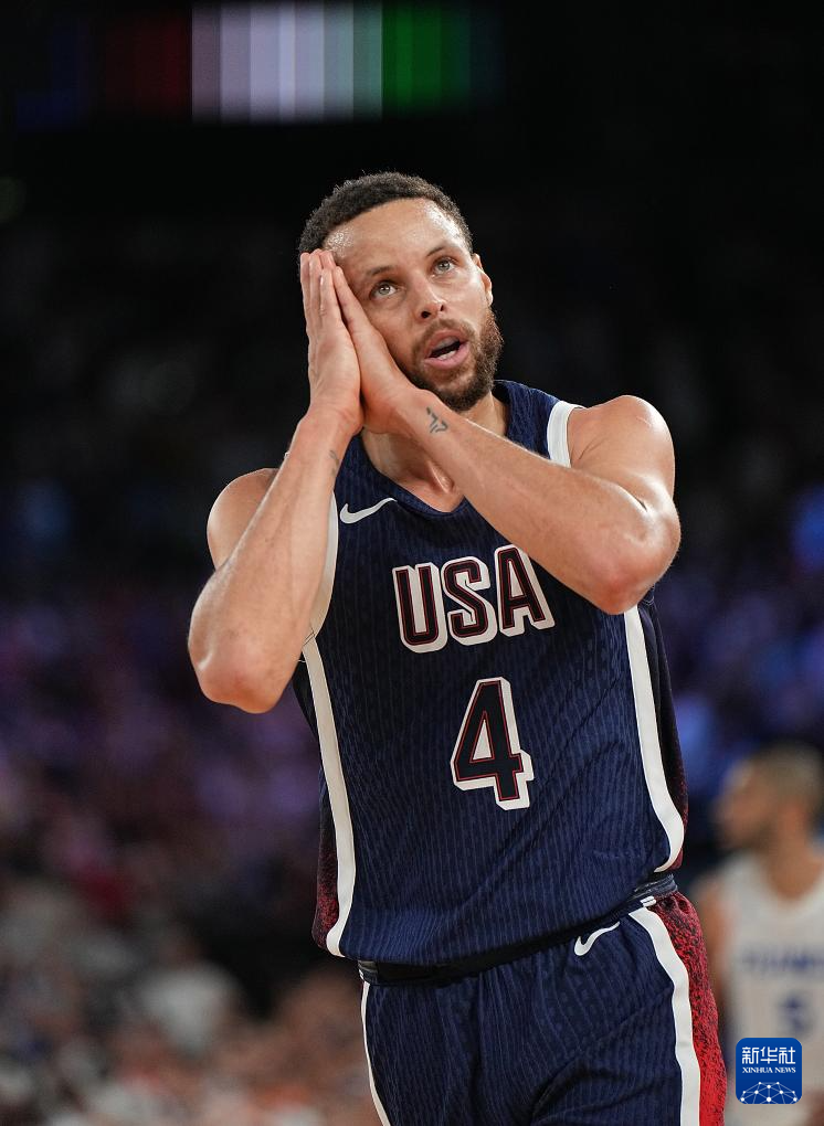 8月10日,美国队球员库里(右二)在比赛中控球。