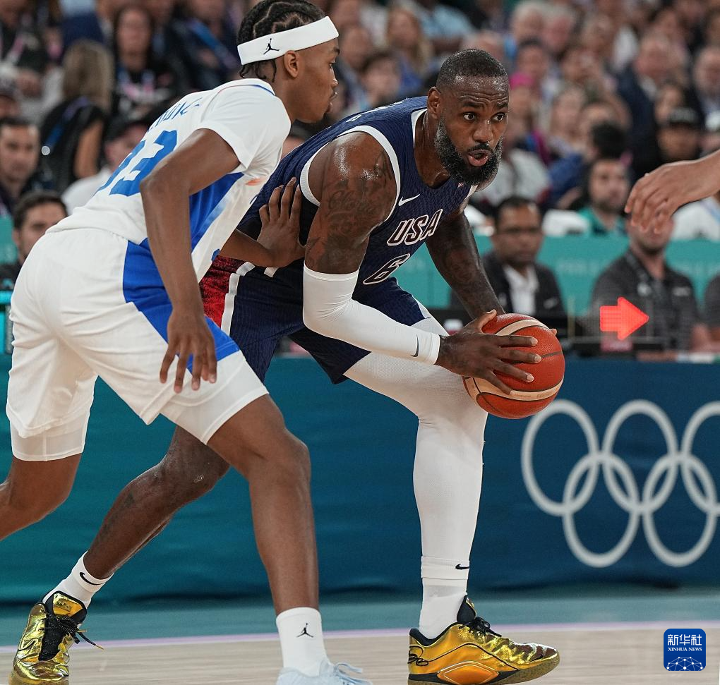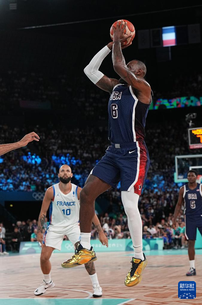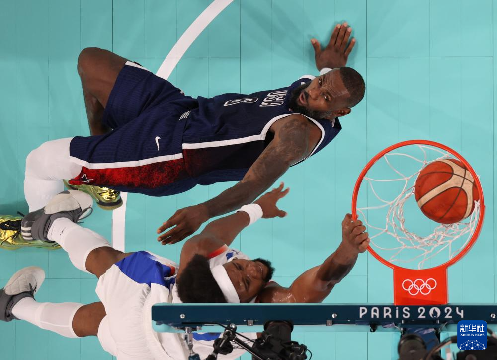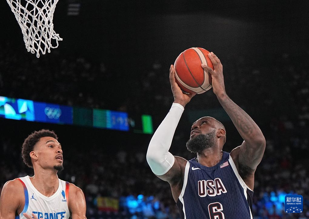 8月10日,美国队球员詹姆斯在比赛中上篮。