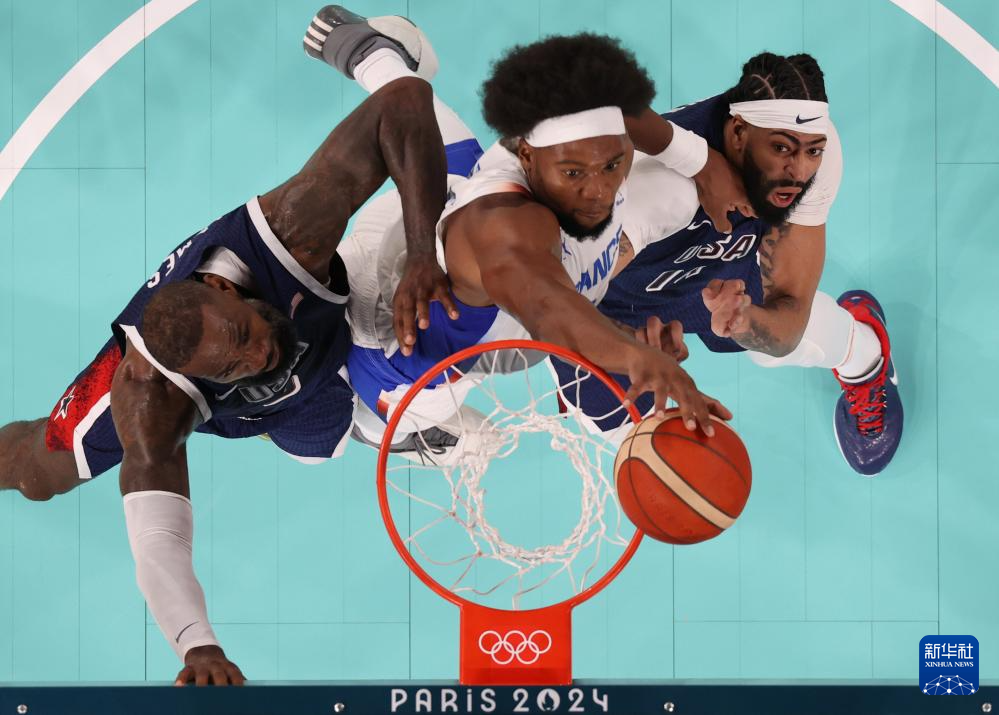 8月10日,法国队球员盖尔雄(中)在比赛中补篮。