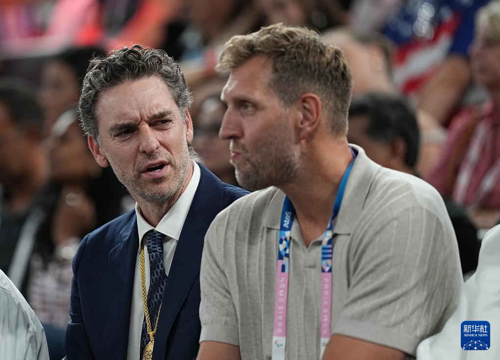8月10日,保罗·加索尔(左)与诺维茨基在场边观赛。