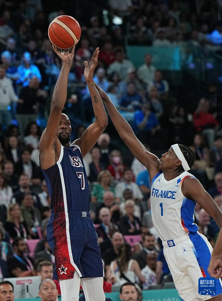 8月10日,美国队球员杜兰特(左)在比赛中投篮。