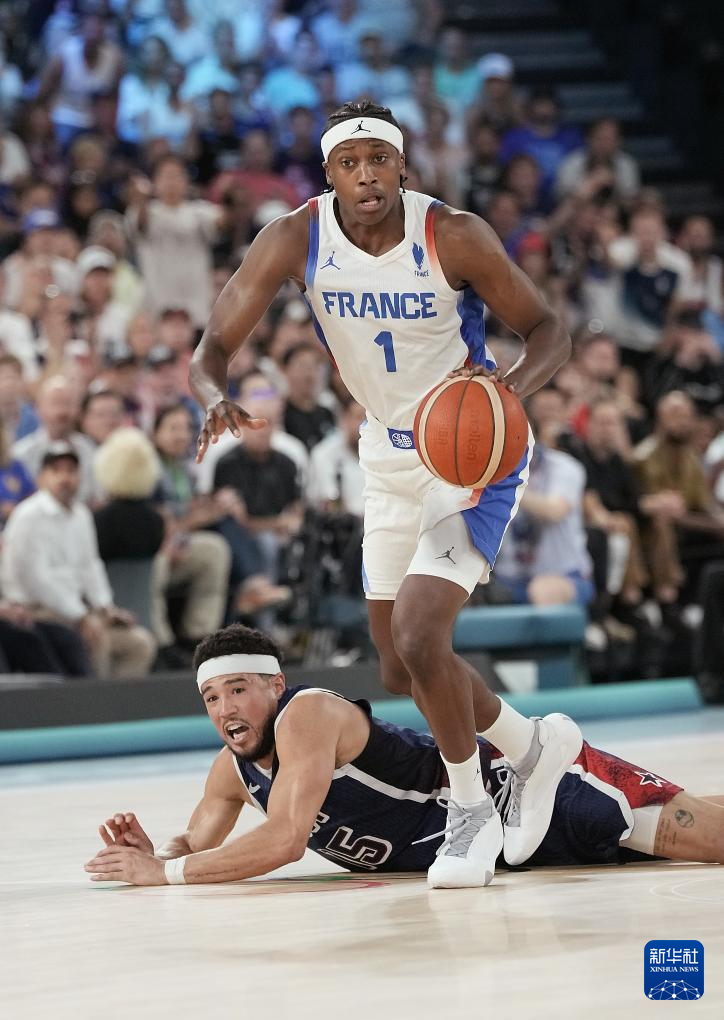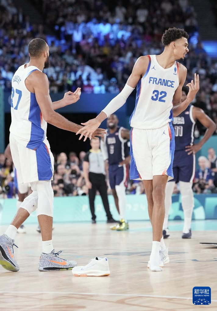 8月10日,法国队球员文班亚马(右)在比赛中鞋子脱落。