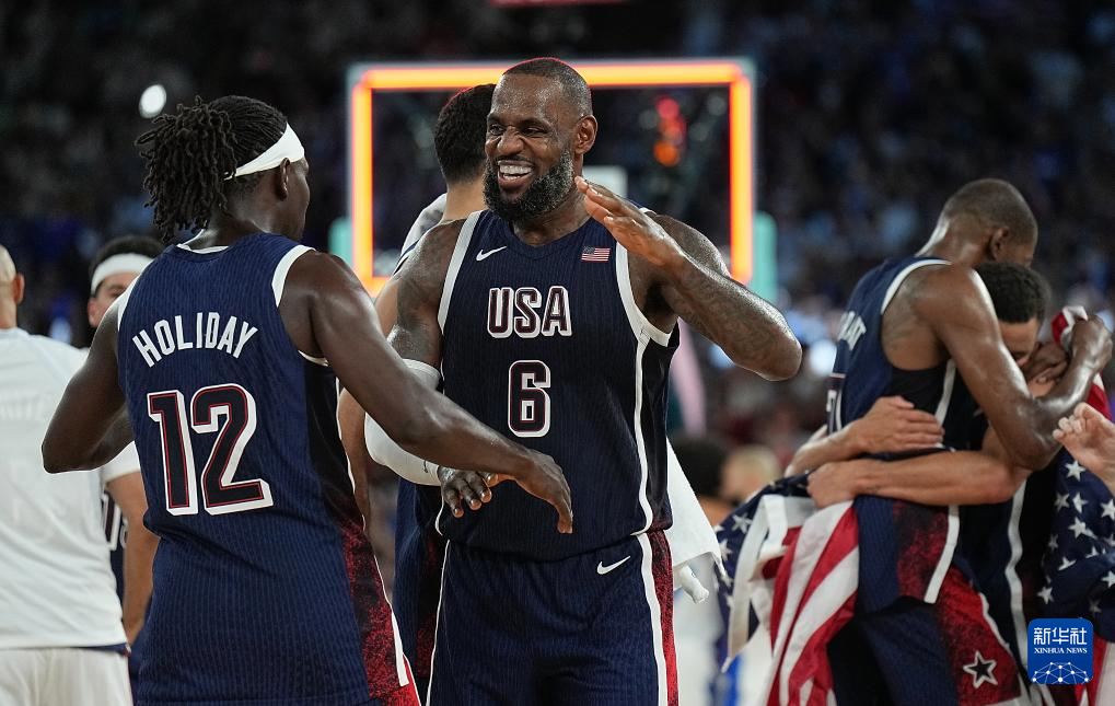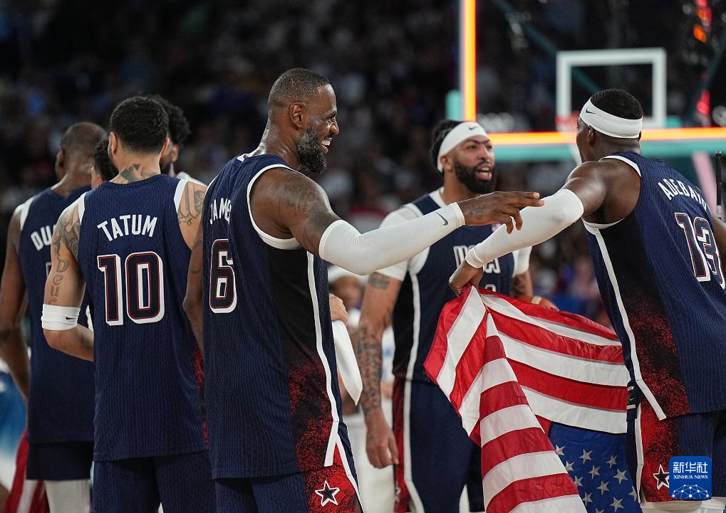 8月10日,美国队球员詹姆斯(左三)与队友庆祝夺冠。