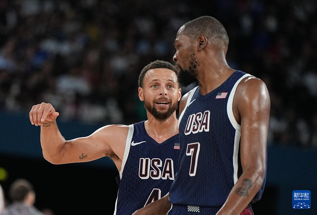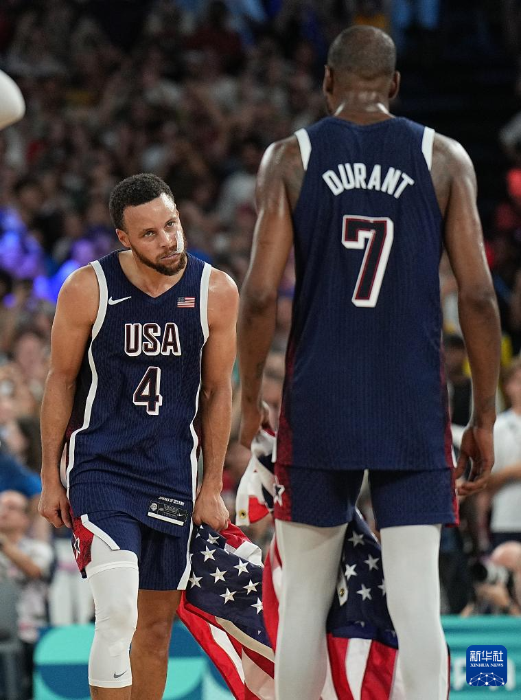 8月10日,美国队球员库里(左)与杜兰特交流。