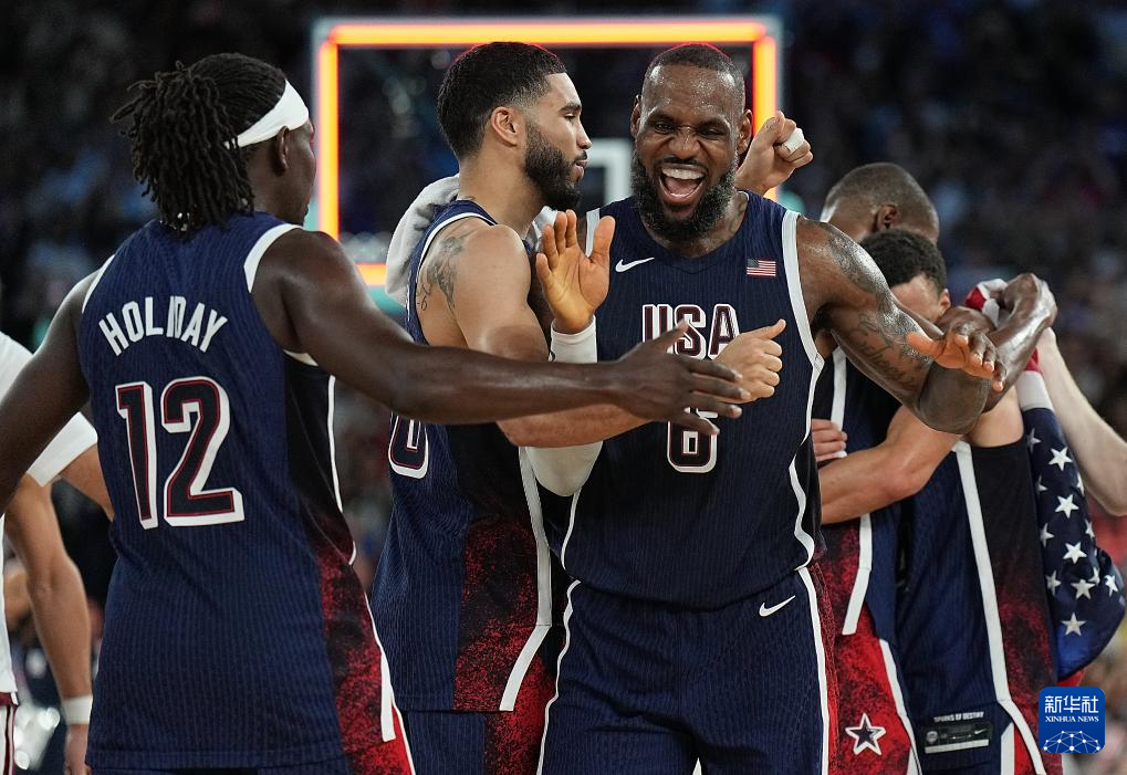 8月10日,美国队球员詹姆斯(中)与队友庆祝夺冠。