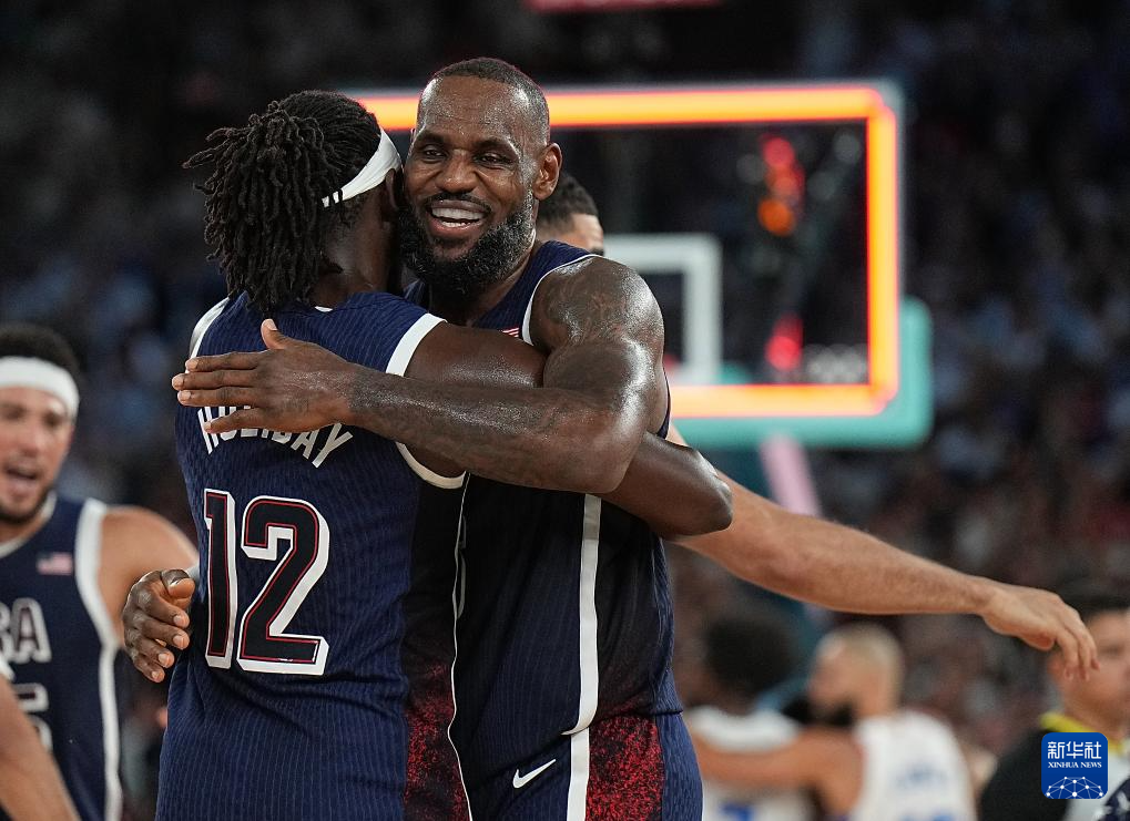 8月10日,美国队球员詹姆斯(右)与霍乐迪庆祝。