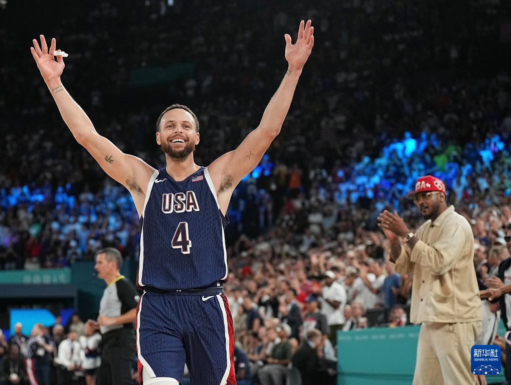 8月10日,美国队球员库里(右)庆祝夺冠。