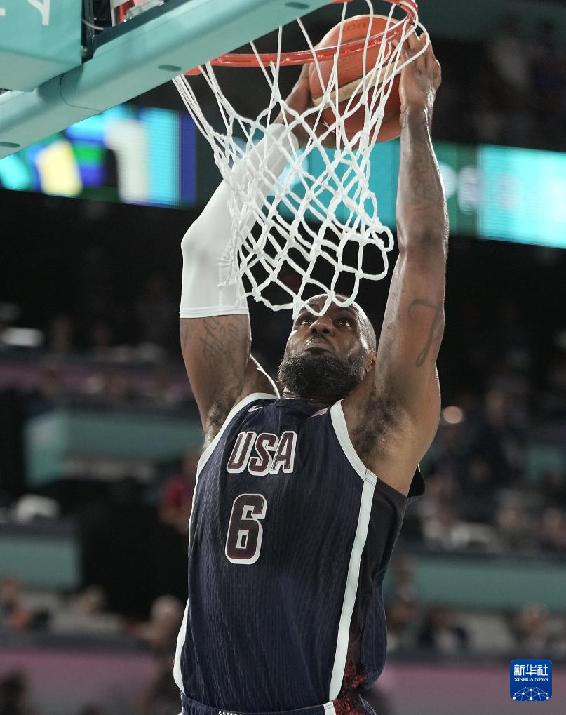 8月10日,美国队球员詹姆斯在比赛中扣篮。