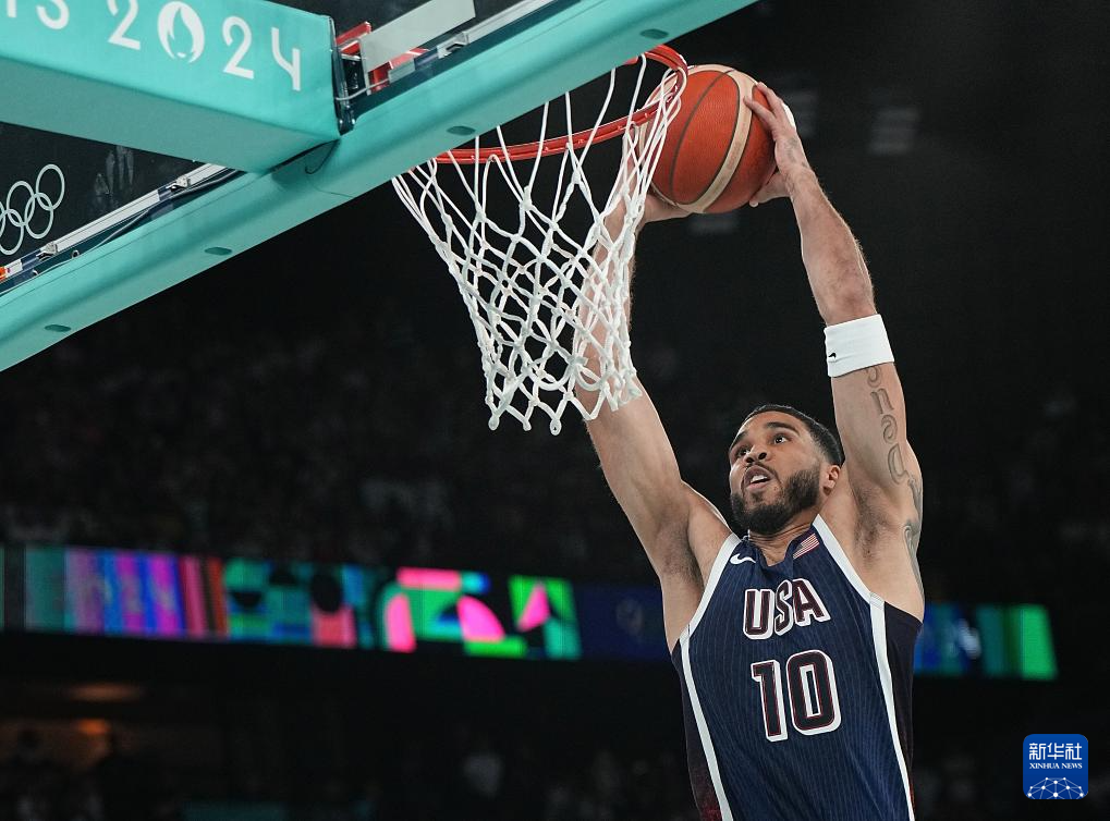 8月10日,美国队球员塔图姆在比赛中扣篮。