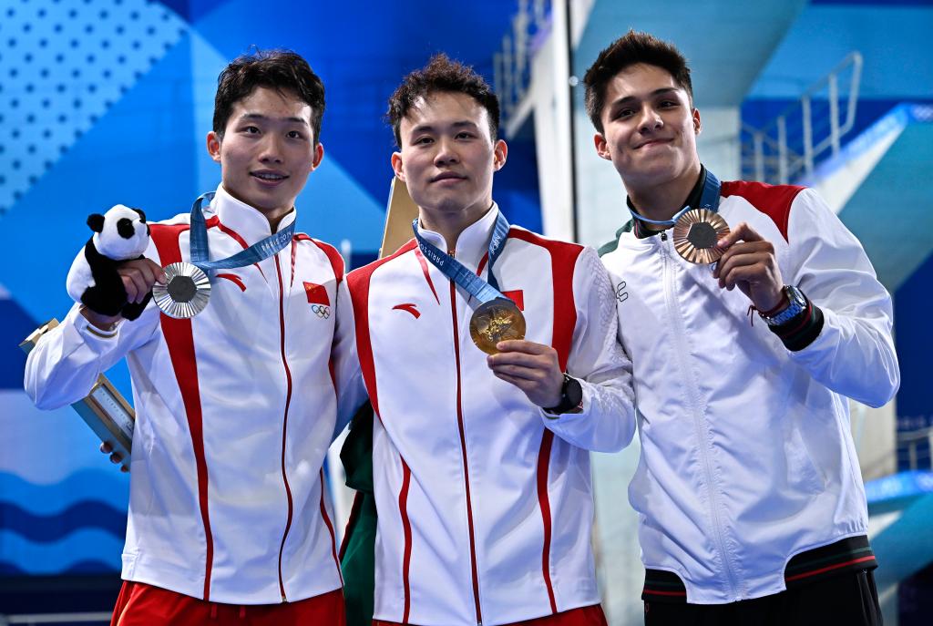 8月8日,金牌得主中国选手谢思埸(中)、银牌得主中国选手王宗源(左)和铜牌得主墨西哥选手奥斯马尔在颁奖仪式上合影。新华社记者 王鹏 摄