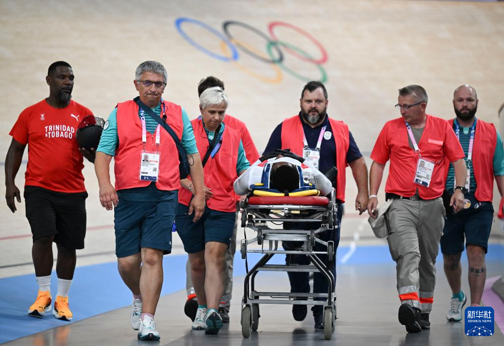8月10日,医疗工作人员护送在复活赛中受伤的特立尼达和多巴哥选手布朗离开赛道。