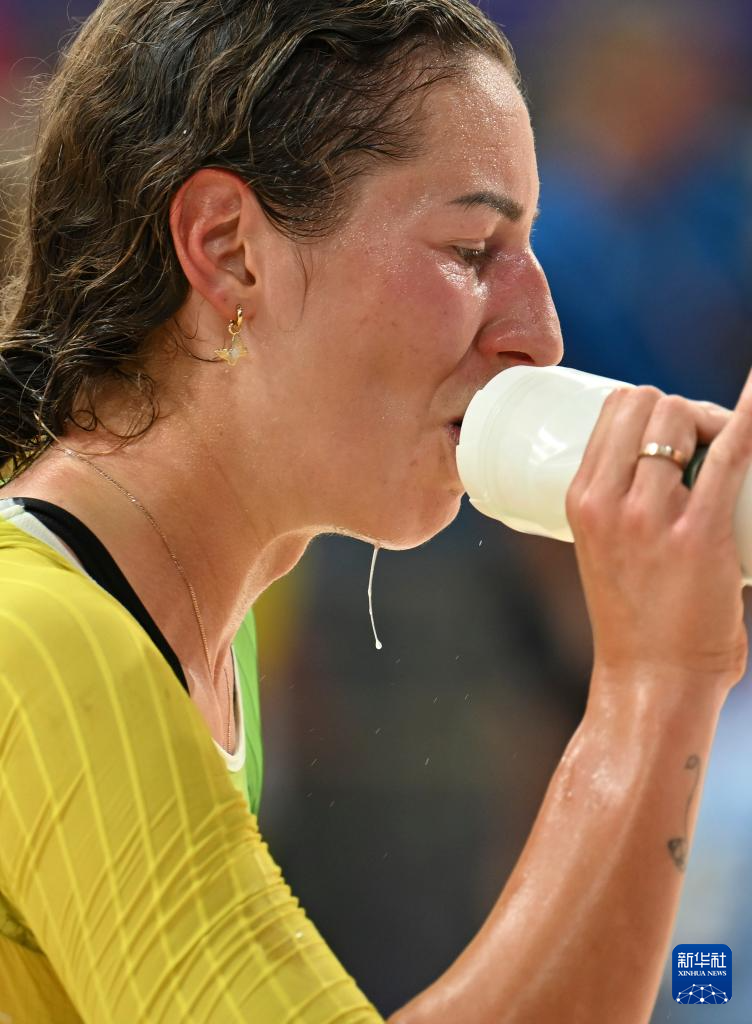 8月11日,立陶宛选手贝莉丝特在女子全能赛记分赛的比赛后补水。最终,她位列第11名。