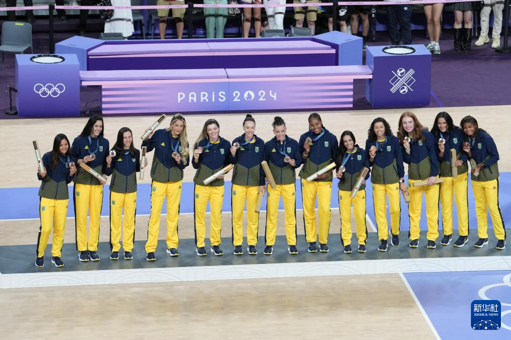 8月11日,获得铜牌的巴西队在颁奖仪式上。