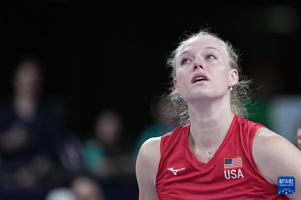 8月11日,美国队球员德鲁斯(左)在比赛中扣球。