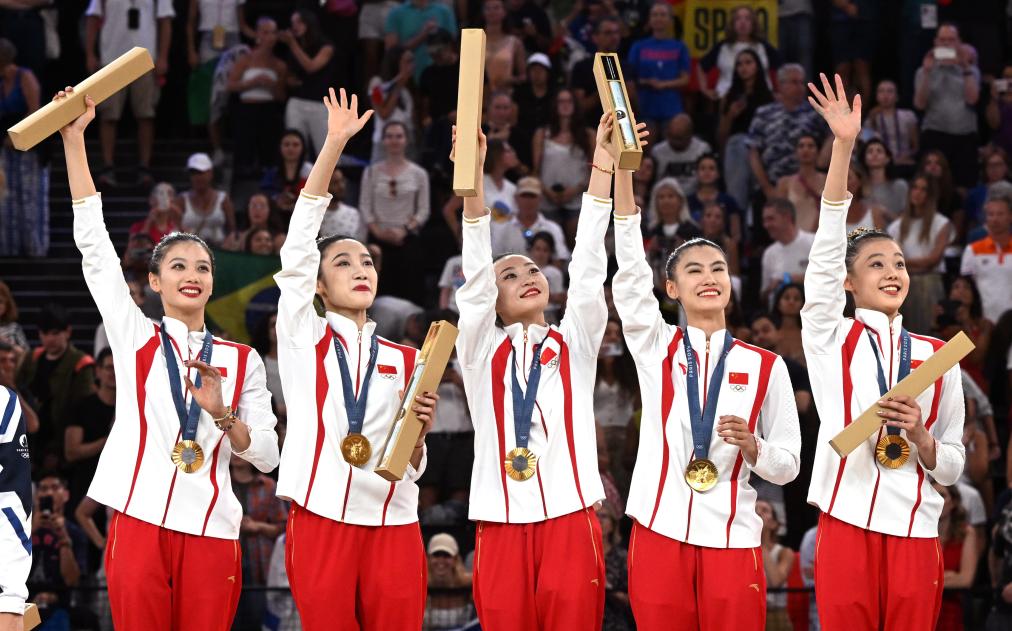 在北京时间8月10日晚结束的巴黎奥运会艺术体操项目集体全能决赛中,由上海选手郭崎琪和队友郝婷、黄张嘉洋、王澜静、丁欣怡组成的中国队勇夺金牌。这是中国艺术体操队首次获得奥运会冠军。