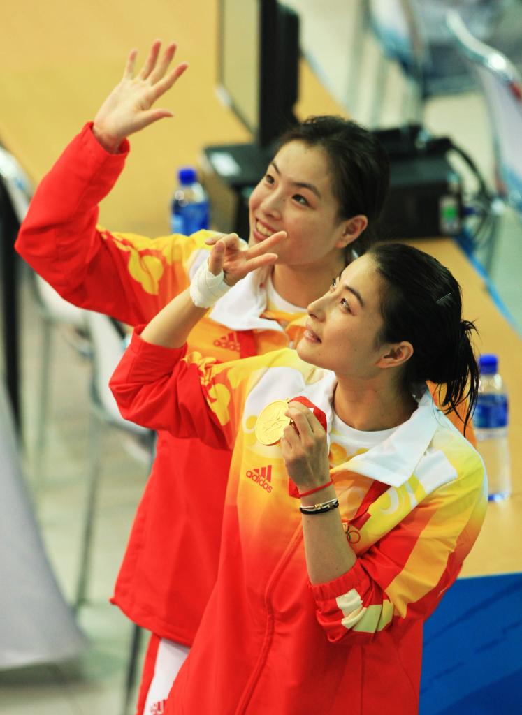 2008年8月10日,郭晶晶(前)与搭档吴敏霞在北京奥运会女子双人3米跳板颁奖仪式后向观众展示金牌。新华社记者 刘宇 摄