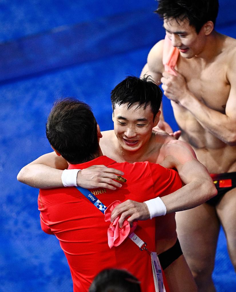 8月6日,全红婵(右)与教练陈若琳庆祝。新华社记者 王鹏 摄