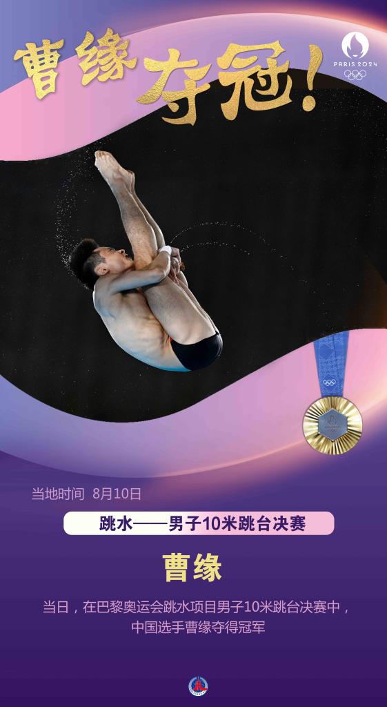 当地时间8月10日,在巴黎奥运会跳水项目男子10米跳台决赛中,中国选手曹缘夺得冠军。