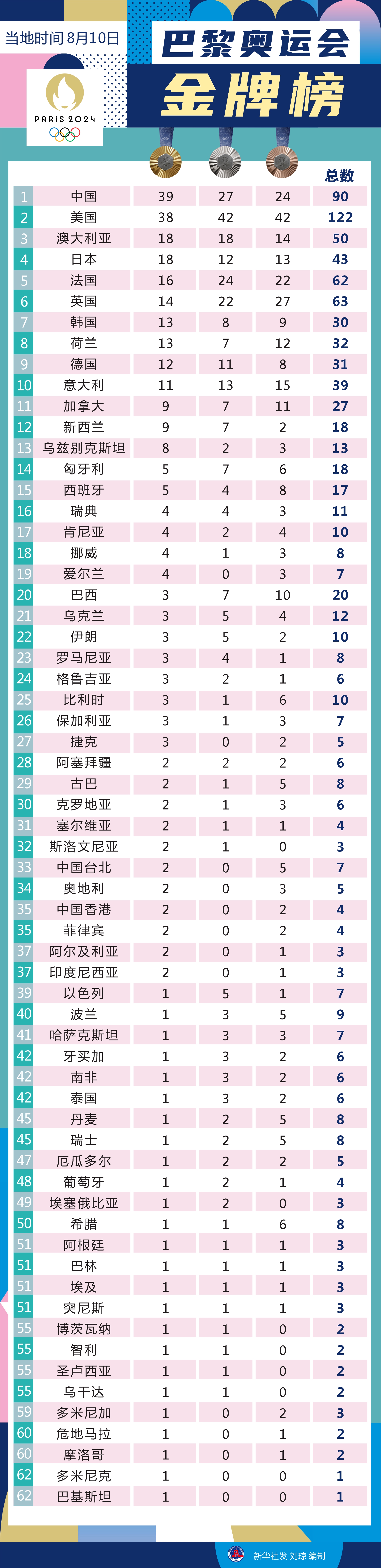 (图表)巴黎奥运会|8月10日巴黎奥运会金牌榜_2024巴黎奥运会_新华网