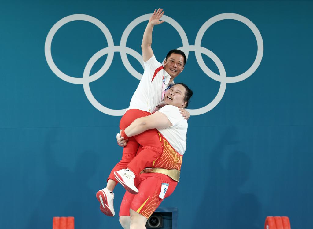 8月11日,中国选手李雯雯(下)抱起教练吴美锦庆祝夺冠。新华社记者 杨磊 摄