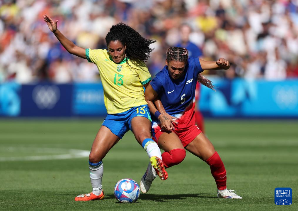 8月10日,巴西队球员塞丝(右)与美国队球员索菲娅·史密斯在比赛中拼抢。