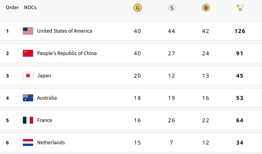 周进强介绍,本届奥运会中国体育代表团参赛运动员404人,共参加了30个大项42个分项232个小项的比赛,在11个大项14个分项上获得40金27银24铜,共91枚奖牌。金牌总数和质量取得突破,40枚金牌超过伦敦奥运会的39金、东京奥运会的38金。获得金牌的运动员达60名,创境外参赛历史新高,与2008年北京奥运会持平。此外,在射击、游泳、举重项目上,打破世界纪录1项、创造奥运会纪录9项次。