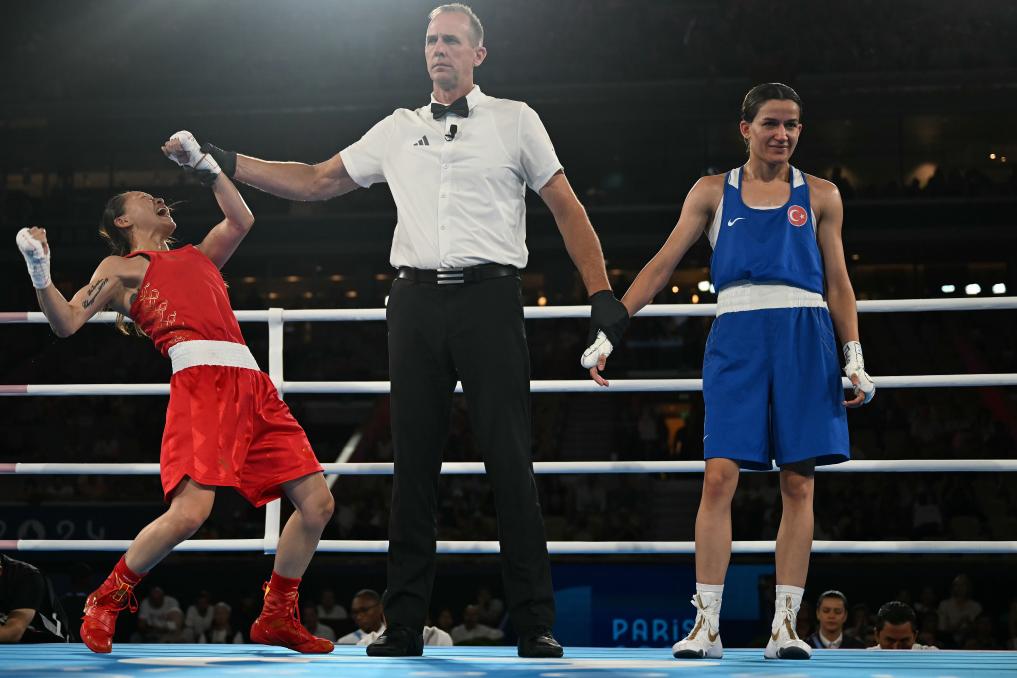 8月8日,裁判宣布常园(左)获胜。当日,在巴黎奥运会拳击项目女子54公斤级决赛中,中国选手常园战胜土耳其选手阿克巴什,夺得冠军。新华社发(POOL照片/莫罗·皮芒泰尔)