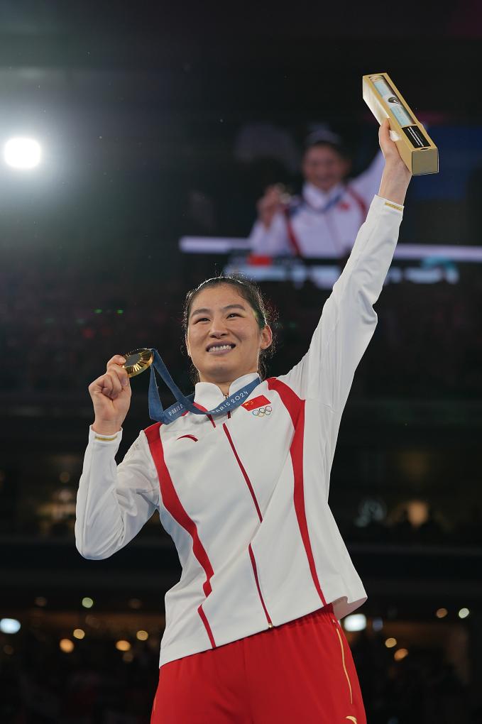 8月10日,冠军中国选手李倩在颁奖仪式上。当日,在巴黎奥运会拳击项目女子75公斤级金牌赛中,中国选手李倩战胜巴拿马选手拜伦,夺得金牌。新华社记者 江文耀 摄