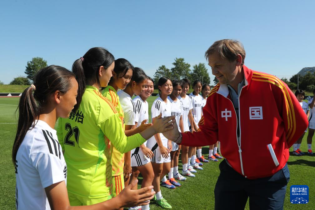8月12日,在德国黑措根奥拉赫,“雏凤计划”女足小球员在训练后与阿迪达斯全球首席执行官比约恩·古尔登击掌。新华社记者 杜哲宇 摄