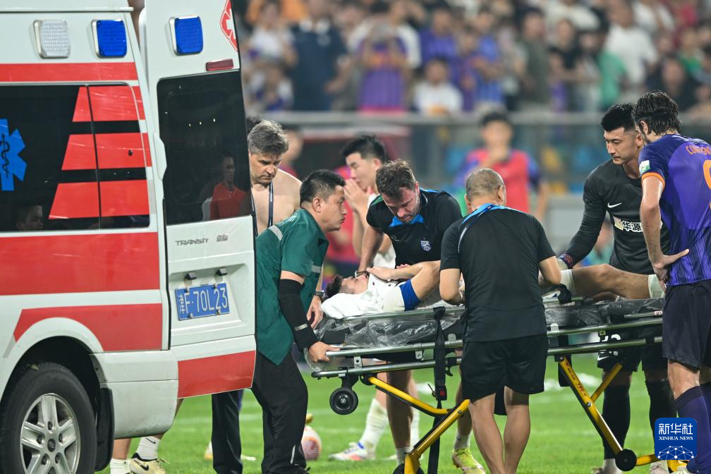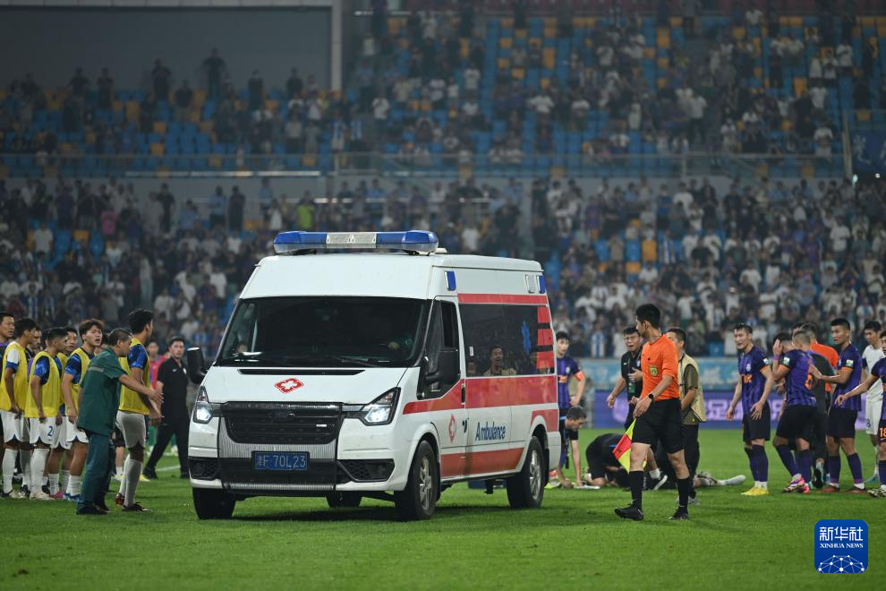 8月16日,救护车紧急进场对武汉三镇队球员吾米提江·玉苏普进行救治。