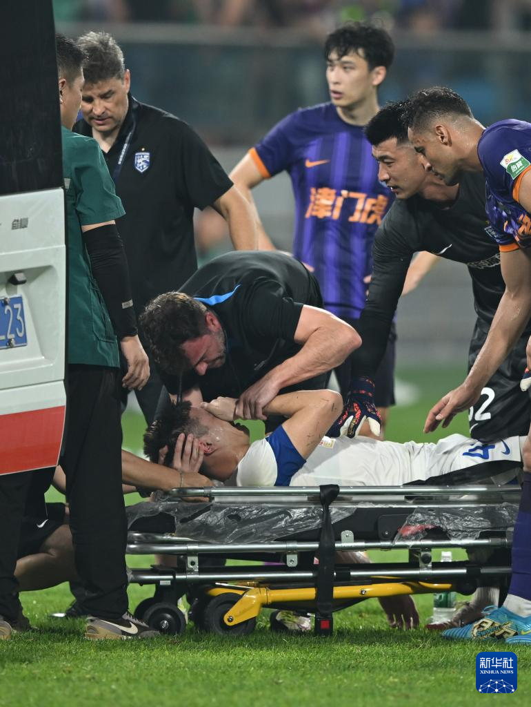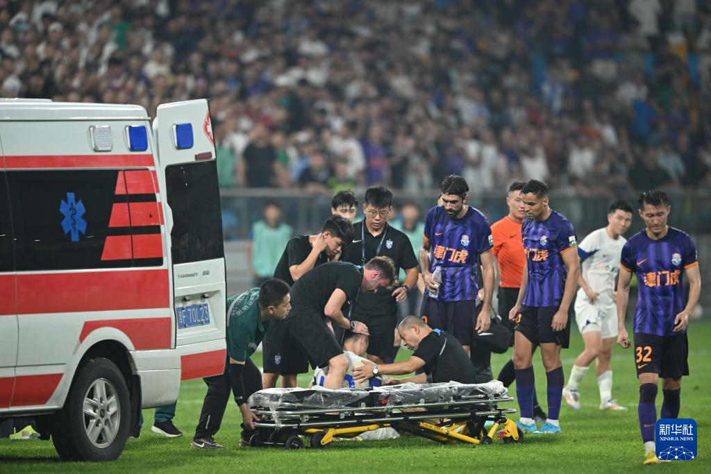 8月16日,救护车进场对武汉三镇队球员吾米提江·玉苏普(下)进行紧急救治。