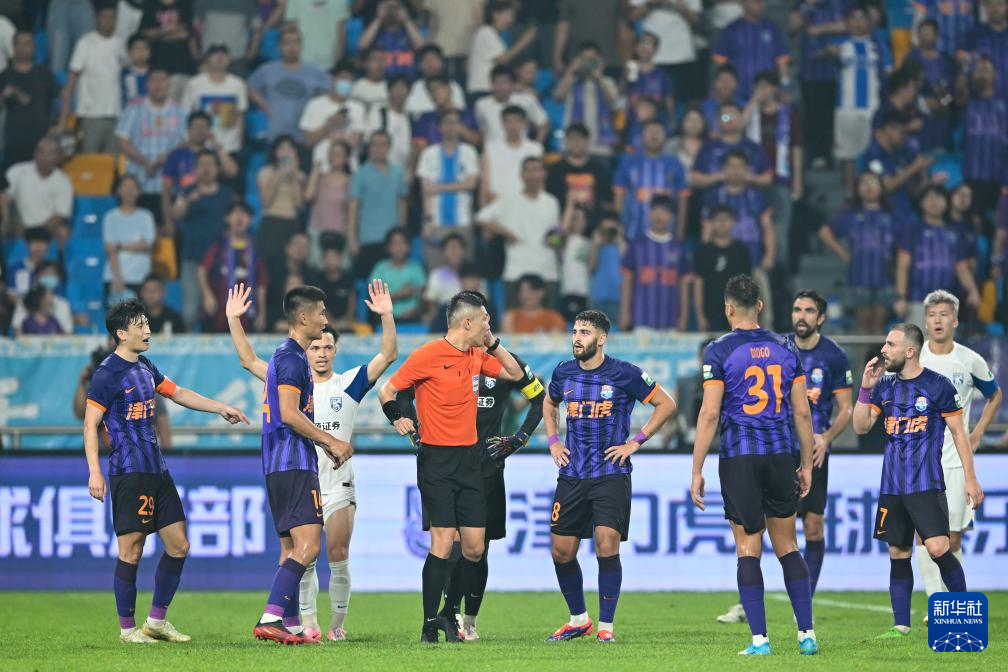 8月16日,天津津门虎队球员在下半场补时阶段与主裁判沈寅豪(左四)交涉。
