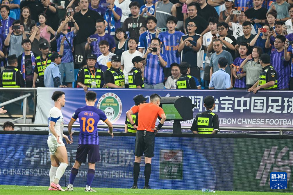 8月16日,主裁判沈寅豪(前右)在下半场补时阶段查看VAR(视频助理裁判)。