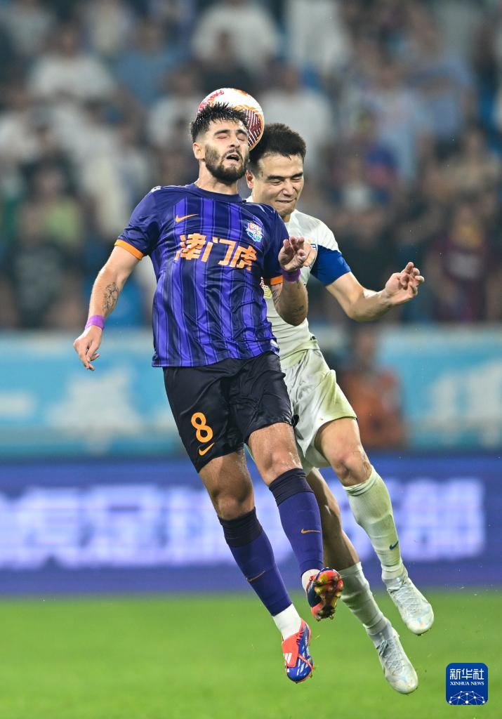 8月16日,武汉三镇队球员吾米提江·玉苏普(右)与天津津门虎队球员哈达斯在比赛中头球拼抢,吾米提江·玉苏普受伤,随后被救护车送往医院。
