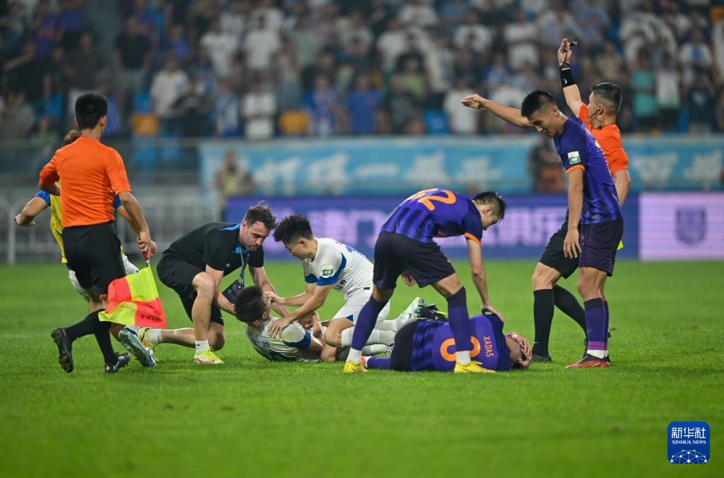 8月16日,裁判、双方球员查看武汉三镇队球员吾米提江·玉苏普(左三)伤情。