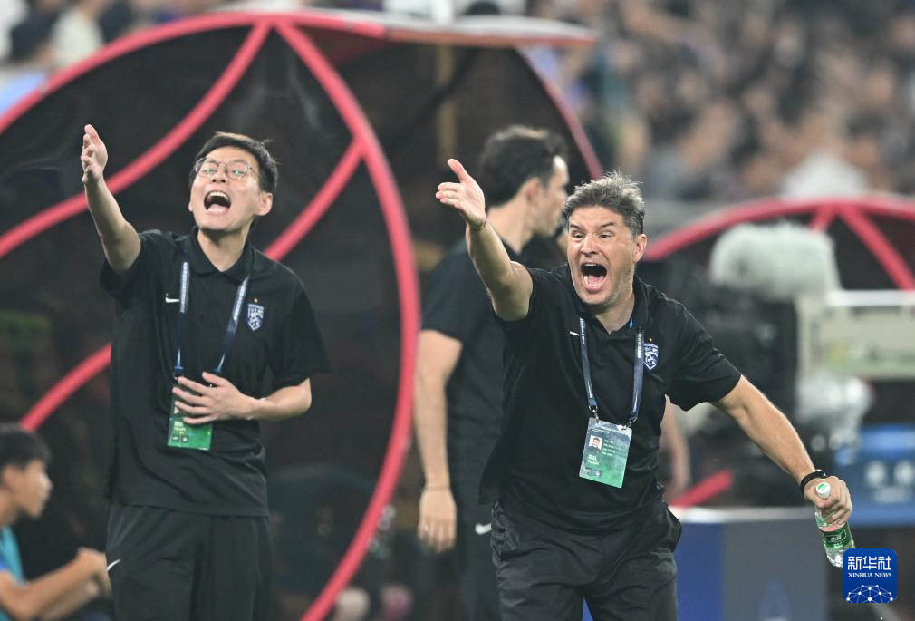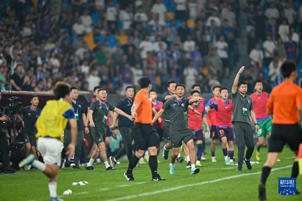 8月16日,武汉三镇队主教练里卡多(右)呼唤场边替补球员。