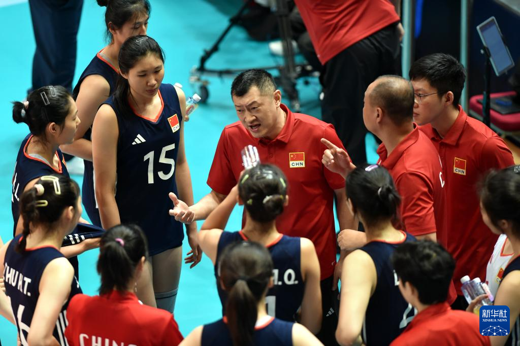 8月17日,中国队主教练匡琦(中)在比赛间隙向球员布置战术。新华社记者 卢炳辉 摄