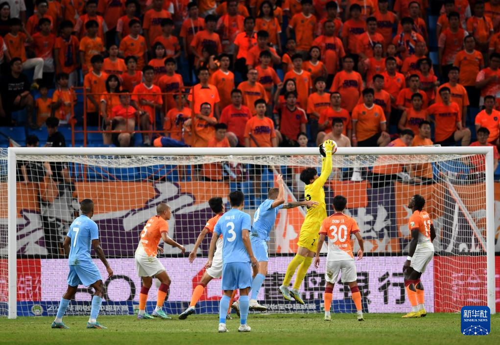 8月17日,青岛海牛队守门员牟鹏飞(右三)在比赛中扑救。新华社记者 李紫恒 摄
